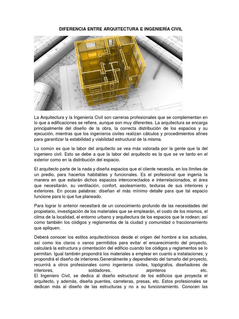 La ingeniería civil, en cambio, se …. En este video podrán conocer la diferencia entre arquitectura e ingenieria civil 2021 de una manera resumida y simple.
